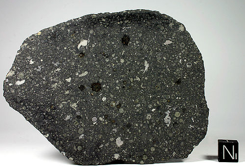 Figure ITE19. Section through an Allende meteorite. The cube on the right has 1-centimetre sides. From [27].