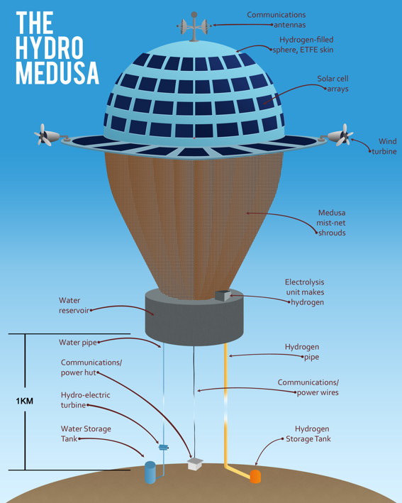The Hydro Medusa consists of a tethered, hydrogen-filled balloon structure, with devices to trap solar and wind power and gather water from moisture in the air. Some of the power generated is used to make hydrogen from the water, and water and hydrogen in excess of that needed to maintain the device is piped to the ground.