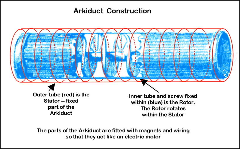 The outer part of the Arkiduct will normally be another cylinder, fixed in the containing piece of equipment. This equipment might be a pump, a propeller, a motor, or a generator. The Arkiduct is equipped with electrical wiring and magnets, as in a conventional motor or generator -- application of electrical power will cause the Rotor to rotate within the Stator.