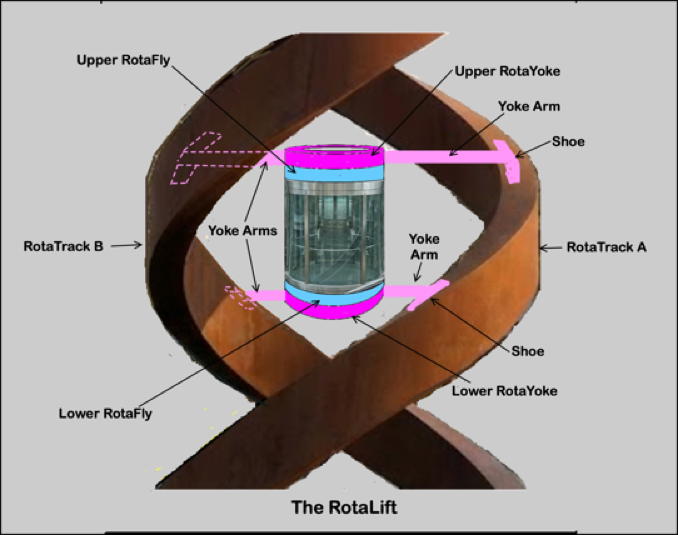 The RotaTracks are a pair of helical guideways, possibly of reinforced concrete, capable of bearing the weight of the cabin, and containing the necessary magnet sets to enable the Shoes to float above the track solid surface.