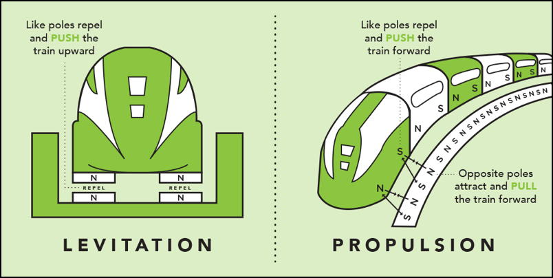 Second, the train is moved forward by activating magnets of opposite polarity, so north and south poles attract and move the train in the desired direction. This is technically a linear motor, like a normal electric motor unrolled flat.