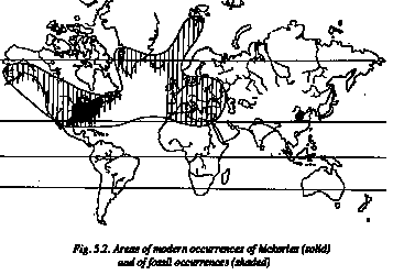 5.2, a map of areas of occurrence of fossil and modern hickories, taken from