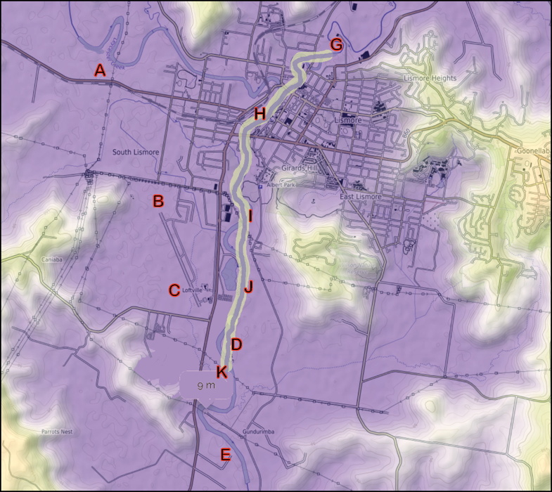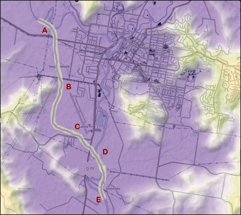 Figure F5 shows the layout of Lismore and its environs as of 2022. It can be seen that the principal sources of water coming into Lismore are firstly Leycester Creek, from the West-Northwest, and Wilsons River, coming in from the East-Northeast.