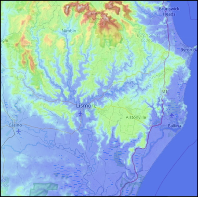 The topography of the Lismore district (Figure F2) shows why Lismore is so liable to flooding. Higher lands, to the west, north, and east, all combine in a single large watershed to direct rainfall to a common point just by Lismore City.